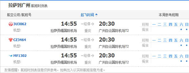拉薩飛廣州的直達航班有3個,航班號有南方航空CZ3464、東方航空MU3279、廈門航空MF1306,詳細的直達航班時刻表如下圖所示:以上就是拉薩飛廣州的航班時刻表,起飛時間,到達時間,及固定航班日期。